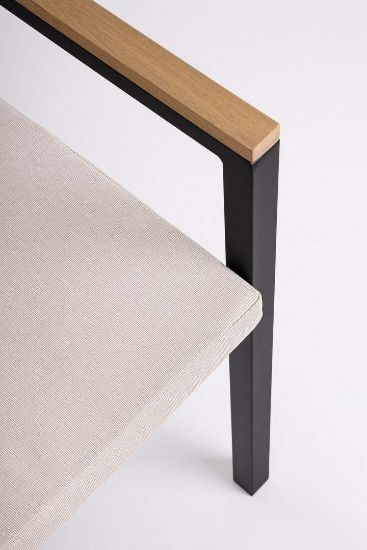 Structure en aluminium, peint à poudre (polyester) : La chaise est équipée d’une structure en aluminium, traitée par un revêtement à poudre en polyester. Ce procédé garantit une finition résistante aux intempéries, aux rayures et à la corrosion, tout en offrant une belle apparence. Cela permet également à la chaise de conserver sa robustesse tout en restant légère.