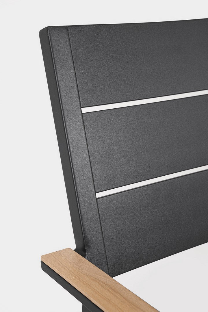 Accoudoirs en aluminium avec peinture effet bois : Les accoudoirs sont conçus en aluminium avec un revêtement de peinture effet bois. Cette finition imitant le bois apporte une touche naturelle et chaleureuse à l’ensemble, tout en maintenant la légèreté et la durabilité de l'aluminium.