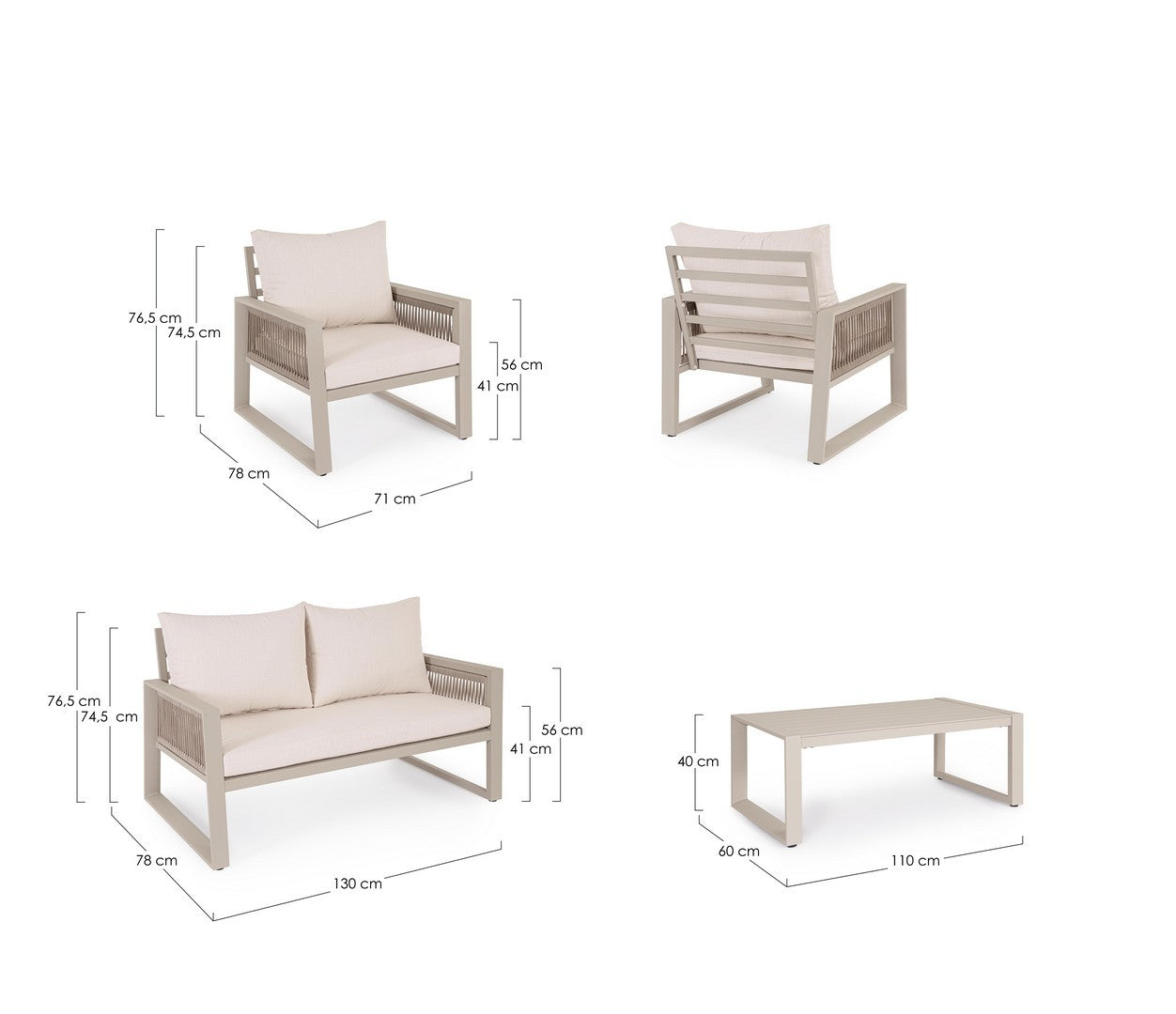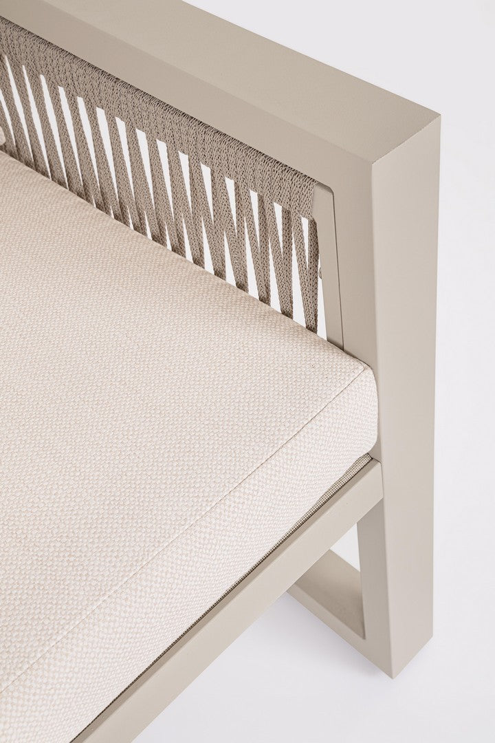 La structure est en aluminium, cordage textilène, coussins déhoussables tissu hydrofuge SPUNPOLY, garantissant une résistance à l'humidité et un entretien facile, parfait pour l'extérieur.